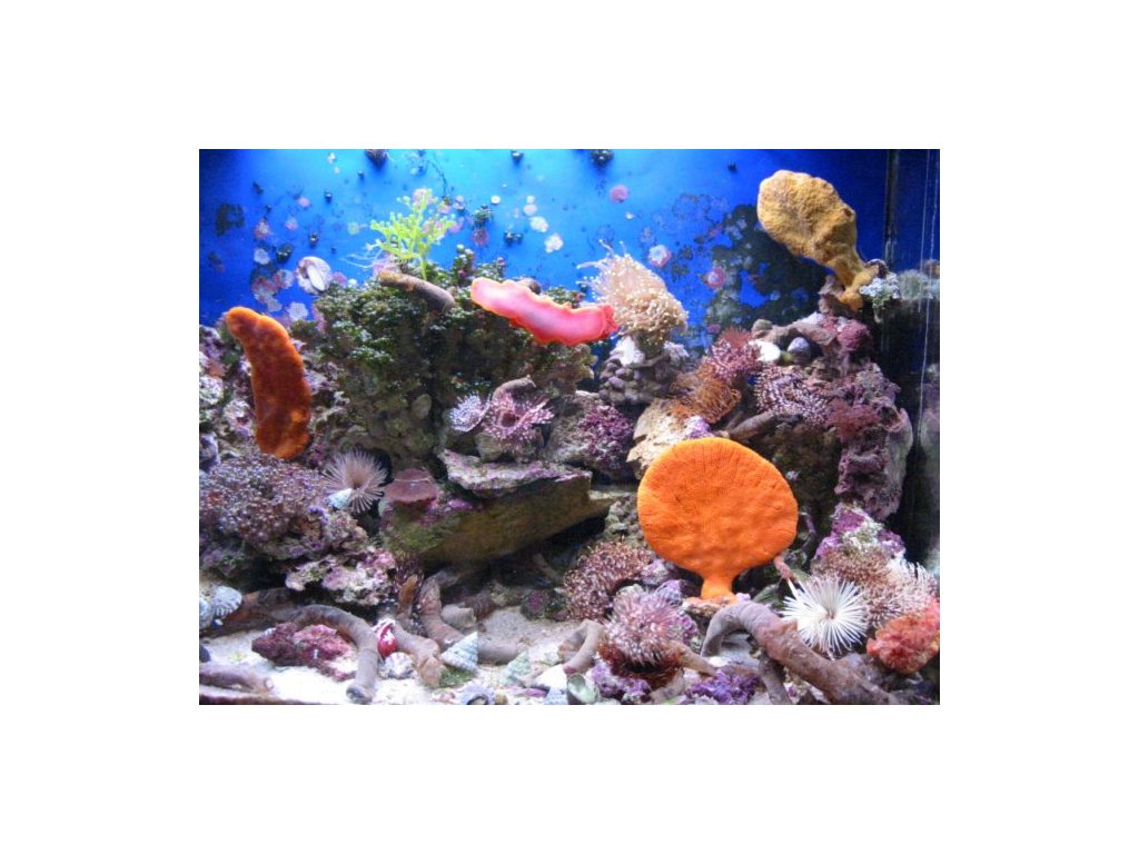 Kompletní sestava včetně živých mořských kamenů, písku a vody.