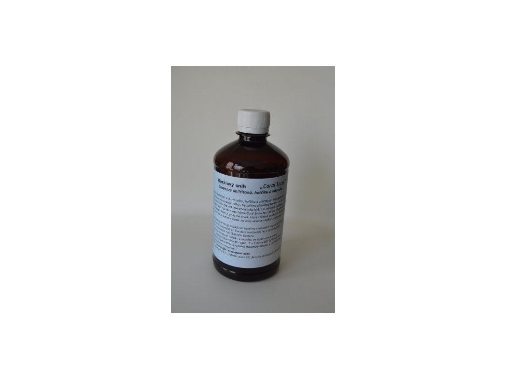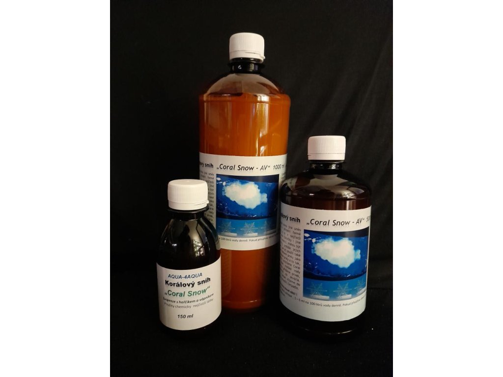 Korálový sníh - Coral Snow AV - obsahuje mimo jiné směs vápníku a hořčíku v přírodní formě v přesném poměru a to v nejčistší laboratorní kvalitě a také stroncium a malou část jódu. Jeho částečky i jiné prvky, které se na ně navazují, mohou být přímo přijímány korály, protože jejich velikost je do 2,5 um. Lze jej použít také jako nosnou látku pro některé prvky jako je B, I, K, některé stopové prvky a to tak, že těsně před použitím smícháme Coral Snow se stejným dílem mořské vody z akvária a do sklenice přidáme prvek, který chceme aplikovat do akvária. Necháme chvíli stát a potom vlijeme do vody akvária nejlépe za proudící čerpadlo.