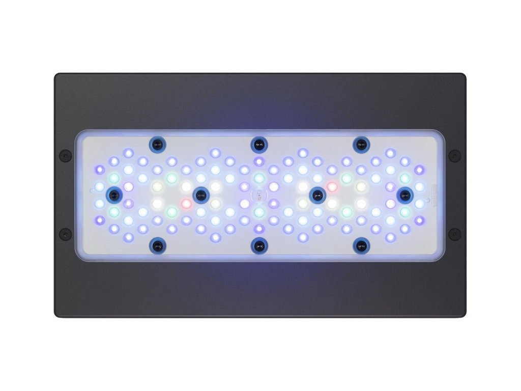 Jeden cluster s geometrickým umístěním LED pro zlepšení šíření a míchání barev. Rovnoměrná distribuce PAR snižuje hot-spoty a prospívá zdraví korálů.