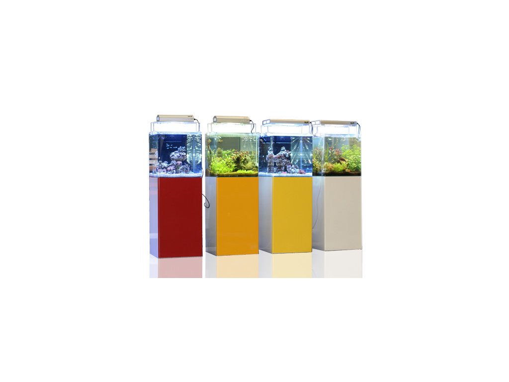 BLAU : "Toto akvárium patří k našim klasikám. Od začátku jsme uvažovali o malém akváriu (45x45x45 cm), které by ale mohlo mít stejné výhody jako velké útesové akvárium. Má optimalizovanou jímku pro uložení minimálních prvků nezbytných pro úspěšný projekt. Nazýváme ho otevřené, protože chceme, aby bylo přístupné příslušenství, které chce jeho majitel používat, aniž by byl vázán povinností používat příslušenství dodávané jako sadu, která má v mnoha případech nevhodnou velikost."