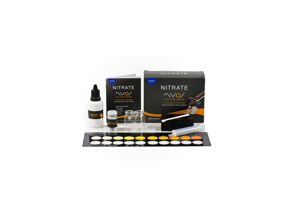 Vysoce přesný nitrátový test s vysoce citlivými reagenciemi: Měřicí rozsah 1 až 160 mg / l nitrátprofesionálně kalibrovaný, opticky měřený na mořskou vodu přizpůsobený plnohodnotný barevný grafdiferencované barevné gradace v dolním rozsahu černé pozadí na barevných grafech pro lepší kontrast posuvný komparátor vyrobený z černých EPStop kvalitních vzorkovacích trubek ze skla pro cca. 40 testů