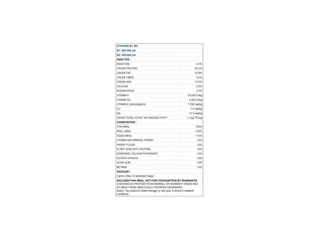 • OTOHIME obsahuje kvasinkové buněčné stěny obsahující β-glukan pro zdravý růst larev ryb. Pro dosažení menších a rovnoměrně velkých částic, které odpovídají evropským požadavkům, byla nainstalována nová moderní třídička materiálu. Vylepšená technologie výroby zajišťuje vynikající dispergovatelnost na vodní hladině a ideální rychlost potápění.